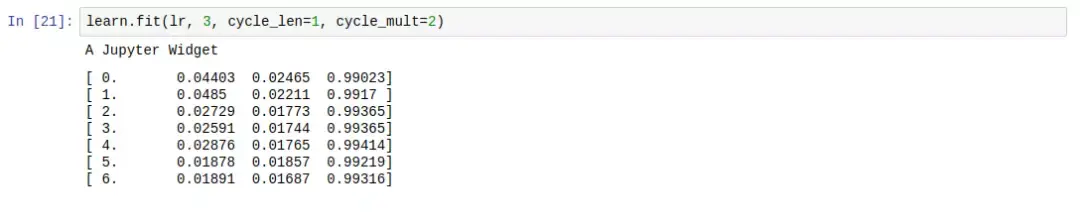 这里的“周期”是指提高学习率的次数。在 fastai 中,可以使用 cycle_len 和 cycle_mult 参数来设置 learner.fit。