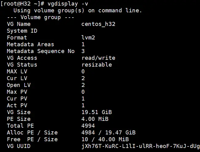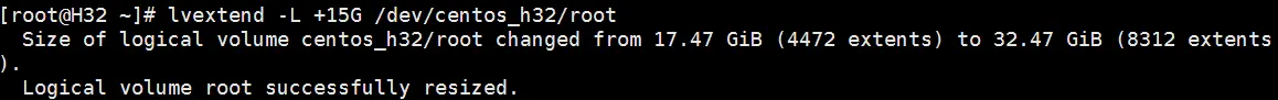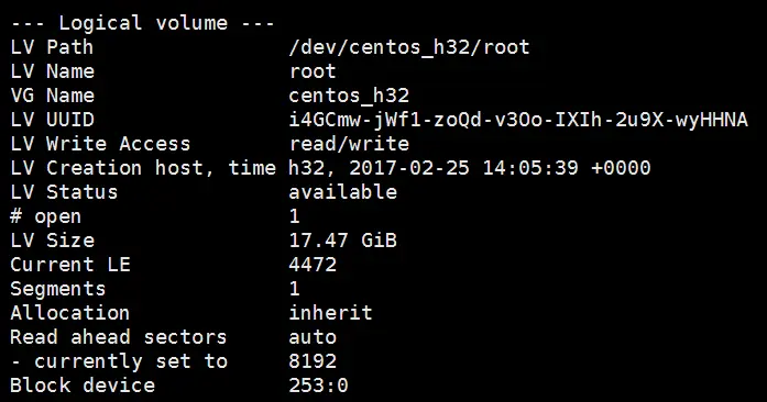 可以看到/dev/centos_h32/root目前的LV Size是17.47GiB。