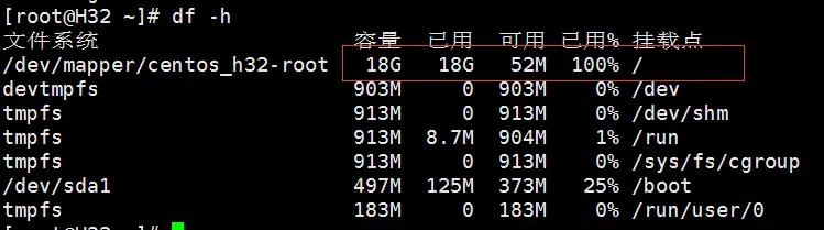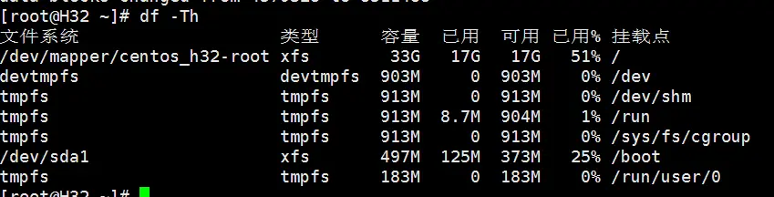 # xfs_growfs /dev/centos_h32/root因为安装CentOS用的xfs分区,所以使用命令xfs_growfs扩展文件系统大小。否则的话使用resize2fs命令。