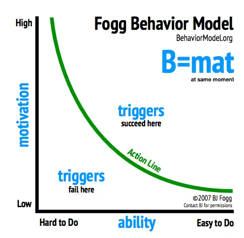 当考虑鼓励某个特定的用户行为策略的时候,你应该从哪里开始?斯坦福 Persuasive Tech Lab 的院长,BJ Fogg博士创建了 Fogg 行为模型,来评估三个因素(能力、触发器、积极性)对于给定行为发生可能性的影响:
