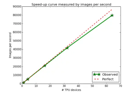 | 随着使用的 TPU 设备数量的增加,在 ImageNet 上进行的 ResNet-50 训练实验显示接近完美的线性加速。 |