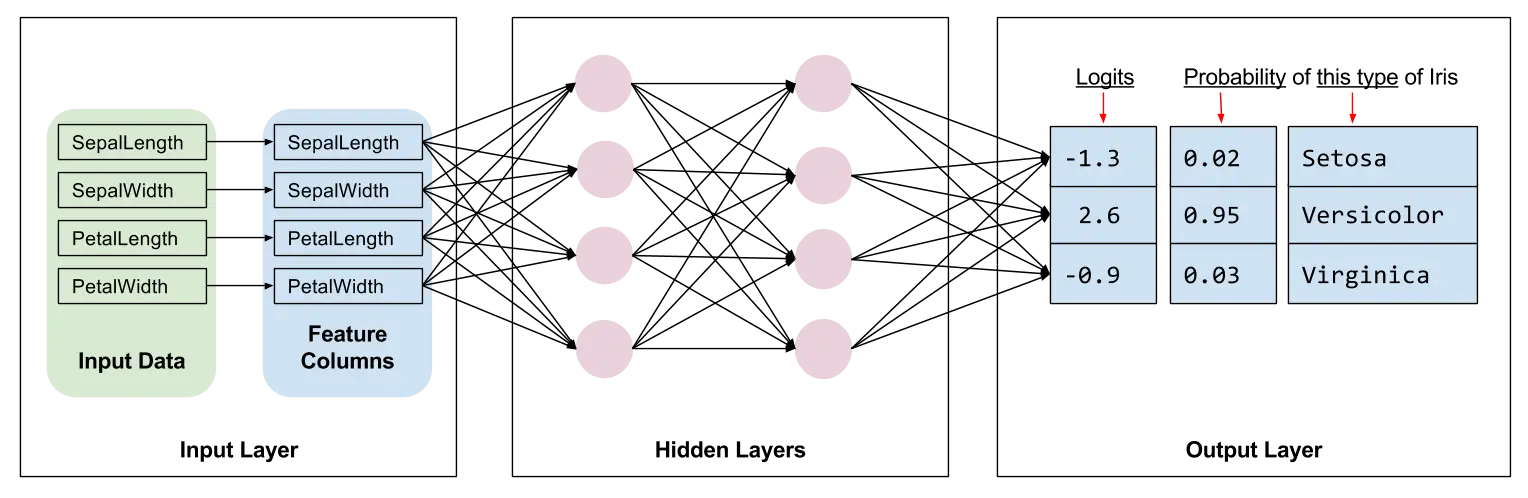 在演示如何以自定义估算器形式实现鸢尾花之前,请回想一下,我们在本系列的第 1 部分是如何以预制估算器形式实现鸢尾花的。在第 1 部分,我们为鸢尾花数据集简单地创建了一个完全连接的深度神经网络,方式是将 预制估算器实例化,如下所示: