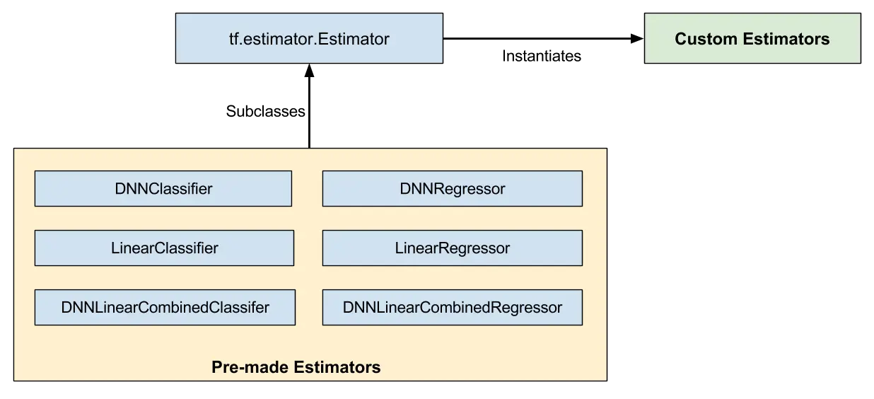 tf.estimator.Estimator 基类的子类,而自定义估算器是 tf.estimator.Estimator: 的实例化 图 1.预制和自定义估算器都是估算器。