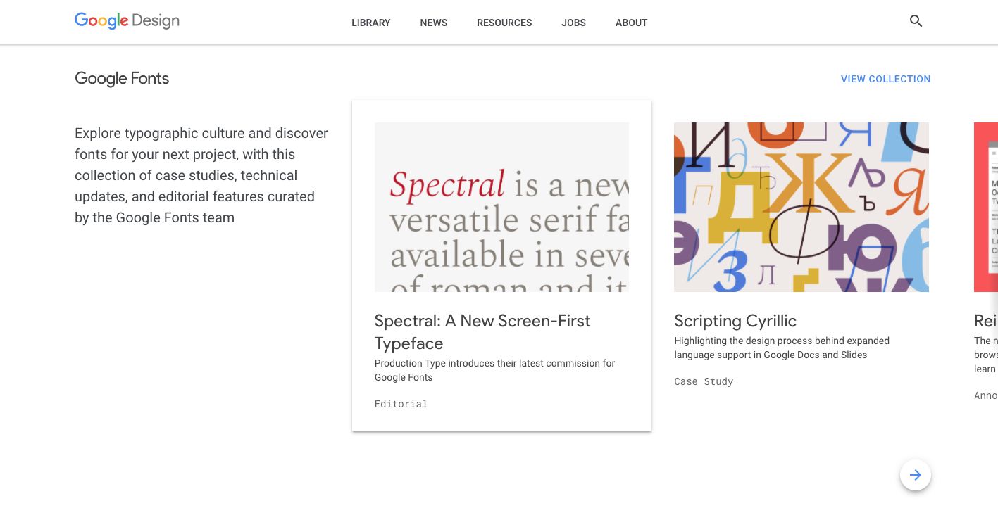 我们的大本营网站也被重新设计了!它添加了全新的新闻部分,方便的收藏功能可以用来放置特定主题或感兴趣的产品领域,如 “字体” 或 “为下一个十亿级用户做设计” 。我们特别想说的是,这个新网站能够让读者一目了然地了解设计师在 Google 上所做的一切。