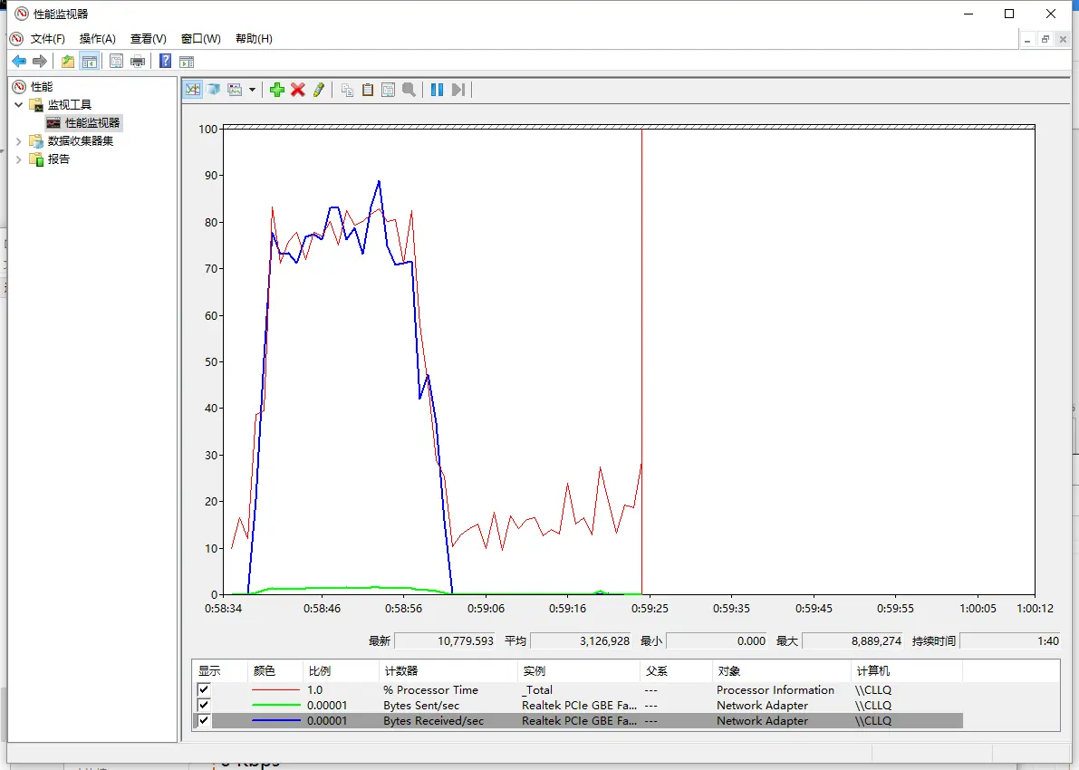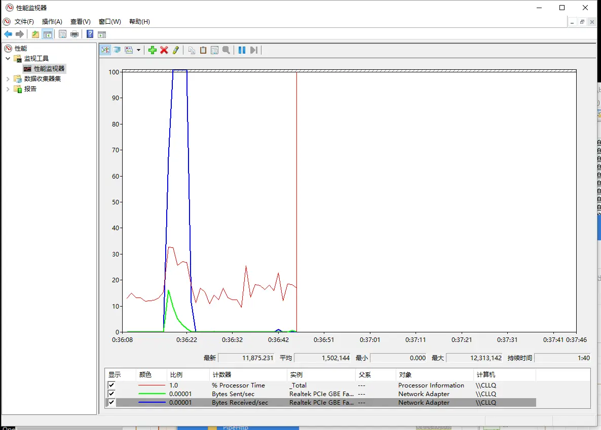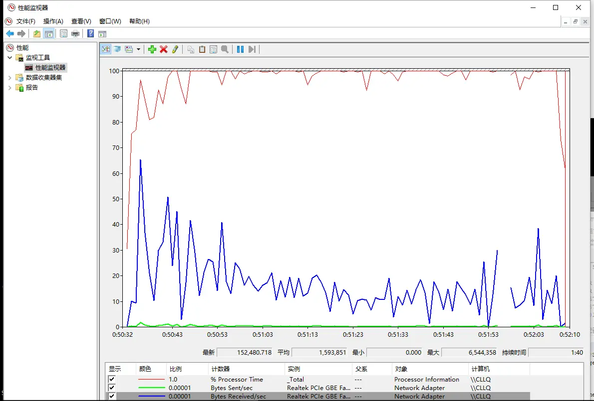 先解释下截图含义,后面的截图也都是同样的含义 第一副为任务管理器的截图实线为接收数据,虚线为发送数据,取样0.5s,每一个正方形的刻度为1.5s(因为任务管理器绘图策略速率上升太快过高的没有办法显示,不过还是可以看到时间线) 第二副为资源管理器,添加了3个采样器,红色为CPU占用率,蓝色为网络接收速率,绿色为网络发送速率。 测试中 一次原始请求大概130字节,加上tcp,ip包头,10000条大概也只有1.5Mb(包头不会太多因为管道式请求里会有多个请求放到一个包里的情况,不过大部分服务器无法有这么快的响应速度会有大量重传的情况,实际上传流量可能远大于理论值) 一次的回包大概在60Mb左右(因为会有部分连接中途中断所以不一定每次测试都会有10000个完整回复) 可以看到使用pipe形式性能表现非常突出,总体完成测试仅仅使用了5s左右 发送本身压力比较小,可以看到0.5秒即到达峰值,其实这个时候基本10000条request已经发送出去了,后面的流量主要来自于服务器端缓存等待(TCP window Full)来不及处理而照成是重传,后面会讲到。 再来看看response的接收,基本上也仅仅使用了0.5s即达到了接收峰值,使用大概5s 即完成了全部接收,因为测试中cpu占用上升并不明显,而对于response的接收基本上是从tcp缓存区读出后直接就存在了内容里,也没有涉及磁盘操作(所以基本上可以说对于pipe这个测试并没有发挥出其全部性能,瓶颈主要在网络带宽上)。 再来看下线程组的方式(100条线程每条100次)
