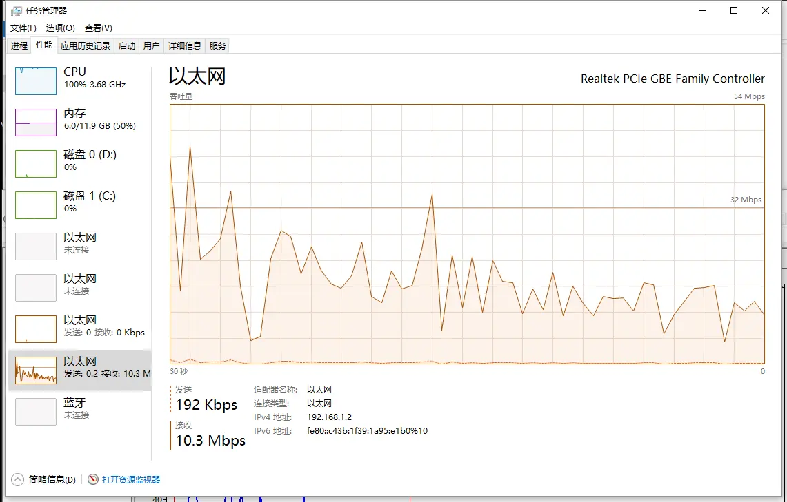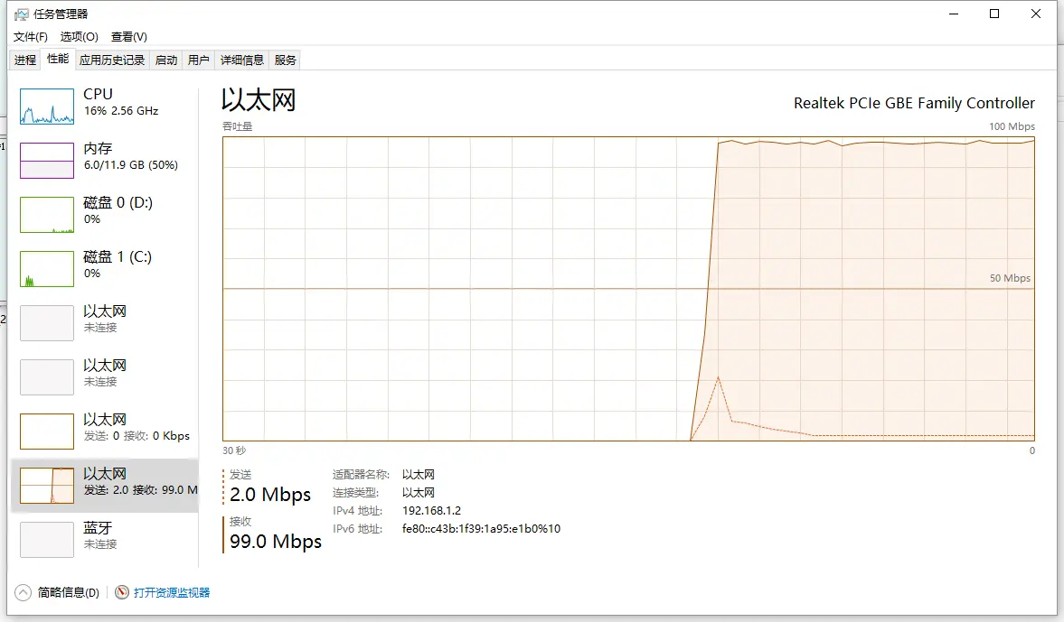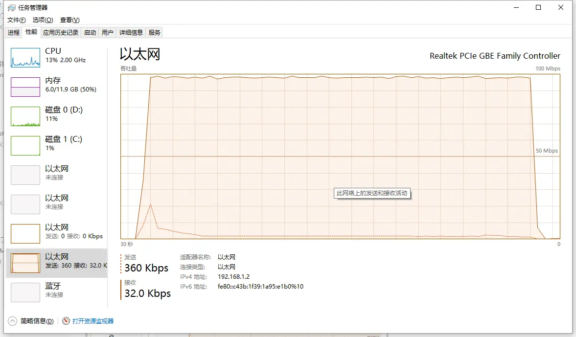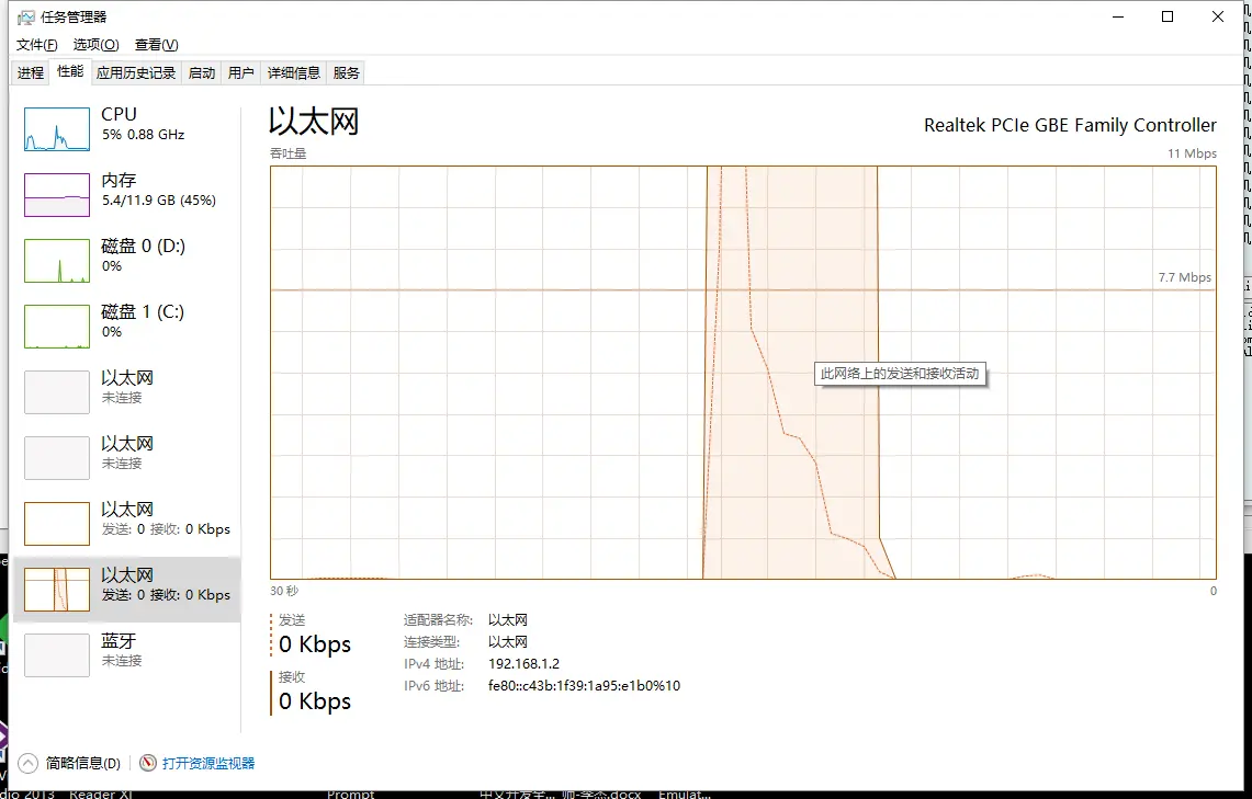 先解释下截图含义,后面的截图也都是同样的含义 第一副为任务管理器的截图实线为接收数据,虚线为发送数据,取样0.5s,每一个正方形的刻度为1.5s(因为任务管理器绘图策略速率上升太快过高的没有办法显示,不过还是可以看到时间线) 第二副为资源管理器,添加了3个采样器,红色为CPU占用率,蓝色为网络接收速率,绿色为网络发送速率。 测试中 一次原始请求大概130字节,加上tcp,ip包头,10000条大概也只有1.5Mb(包头不会太多因为管道式请求里会有多个请求放到一个包里的情况,不过大部分服务器无法有这么快的响应速度会有大量重传的情况,实际上传流量可能远大于理论值) 一次的回包大概在60Mb左右(因为会有部分连接中途中断所以不一定每次测试都会有10000个完整回复) 可以看到使用pipe形式性能表现非常突出,总体完成测试仅仅使用了5s左右 发送本身压力比较小,可以看到0.5秒即到达峰值,其实这个时候基本10000条request已经发送出去了,后面的流量主要来自于服务器端缓存等待(TCP window Full)来不及处理而照成是重传,后面会讲到。 再来看看response的接收,基本上也仅仅使用了0.5s即达到了接收峰值,使用大概5s 即完成了全部接收,因为测试中cpu占用上升并不明显,而对于response的接收基本上是从tcp缓存区读出后直接就存在了内容里,也没有涉及磁盘操作(所以基本上可以说对于pipe这个测试并没有发挥出其全部性能,瓶颈主要在网络带宽上)。 再来看下线程组的方式(100条线程每条100次)