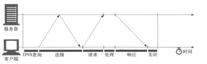 注意,这里的测试如果选择了性能较低的测试对象,大部分流量会在服务器端排队等候,导致吞吐量不大,这实际是服务器端处理过慢,与客户端关系不大。 一般情况下一台普通的pc在使用pipe进行测试时就可以让服务器出现明显延时 原理 正常的http一般实现都是连接完成后(tcp握手)发生request流向服务器,然后及进入等待,收到response后才算结束(如下图)