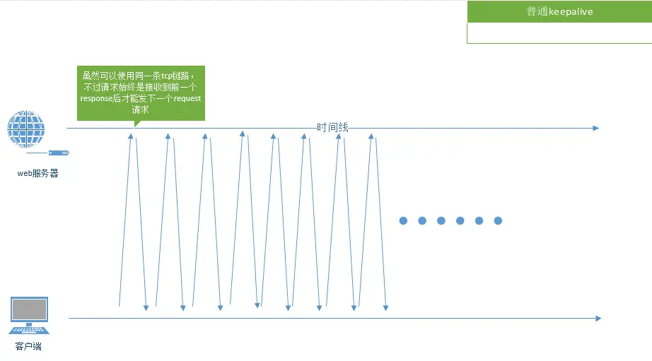 这种方式对性能的提升还是比较明显的,特别早些年服务器性能有限,网络资源匮乏,RTT大(网络时延大)。不过对如今的情况,其实这些都已经不是最主要的问题了 可以明显看到上面的模式,是一定要等到response到达后,客户端才能发起下一个request的,如果应用服务器需要时间处理,所有后面的请求都需要等待,即使不需要任何处理直接回复给客户端,请求,回复在网络上的时间也是必须完整的等下去,而且由于tcp传输本身的特性,速率是逐步上升的,这样断断续续的发送接收十分影响tcp迅速达到线路性能最大值。