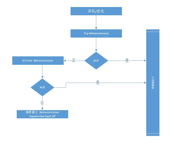 由于发送速度过快直到发出一大半近70个request的时候第一个tcp确认包序号为353的包(只是确认包不是response)才发出(327的ack),而且服务器很快就发现下一个包出问题了并引发了TCP DUP ACK (https://ask.wireshark.org/questions/29216/why-are-duplicate-tcp-acks-being-seen-in-wireshark-capture 产生原因可以参考这里) 【TCP DUP ACK 出现在接收方发现数据包缺口时(数据包失序),这种情况就会发送重复的ACK,这不仅用于快重传,会触发比快重传更快的恢复机制(Fast Retransmission)如果发现重复的ACK,但是报文中未发现缺口,这表示你捕获的是数据来源(而不是接收方),这是十分正常的如果数据在发往接收方的时候发生了丢失。你应该会看到一个重传包】 其实就是说服务器没有发现下一个包后面又发了3次(一共4次·)TCP DUP ACK 都是针对353的,所以后面客户端很快就重传了TCP DUP ACK 所指定的丢失的包(即下面看到的362) 后面还可以看到由于过快的速度,还造成了部分的失序列(out of order)。不过需要说明的是,这些错误在tcp的传输中是很常见的,tcp有自己的一套高效的机制对这些错误进行恢复,即便有这些错误的存在也不会对pipe的实际性能造成影响。 如果服务器异常误包不能马上被恢复可能会造成指数退避的情况如下图