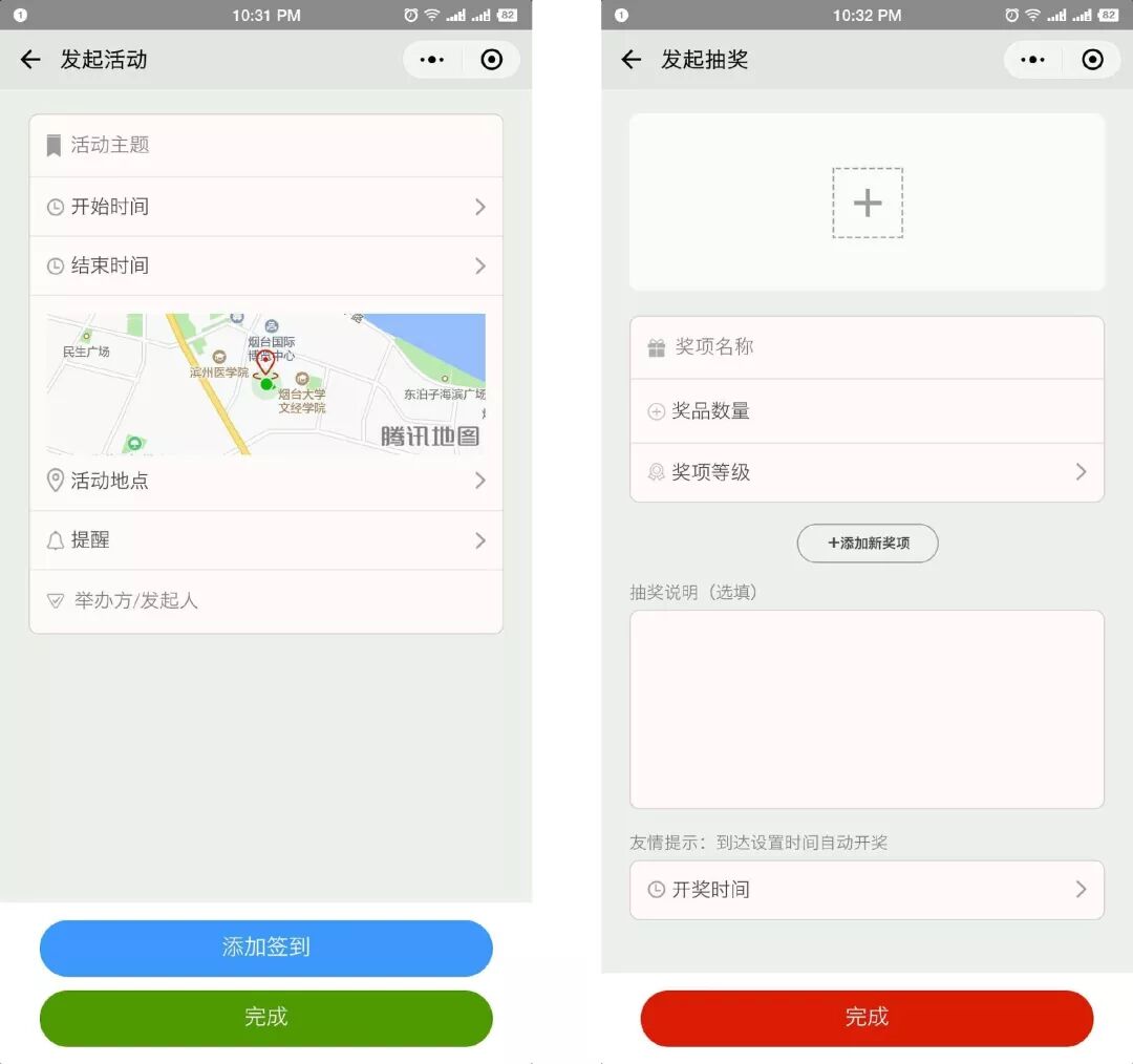 这款软件其实难点不在于设计,也不在于前端界面,是在于后台的逻辑以及数据库的设计,因为我们要求他可以单独发起活动,发起签到,发起抽奖,而他们之间又可以自由组合,可以直发起活动和签到或者签到和抽奖,又或者活动,签到,抽奖一起发起。所以整体的逻辑判断很复杂。