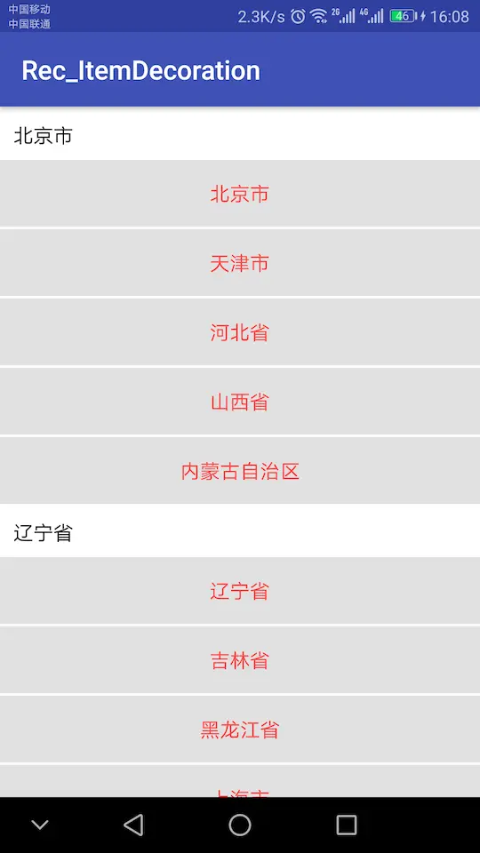 该文详细的介绍了RecyclerView.ItemDecoration实现分组粘性头部的功能,让我们自己生产代码,告别代码搬运工的时代.另外文末附有完整Demo的连接.看下效果:
