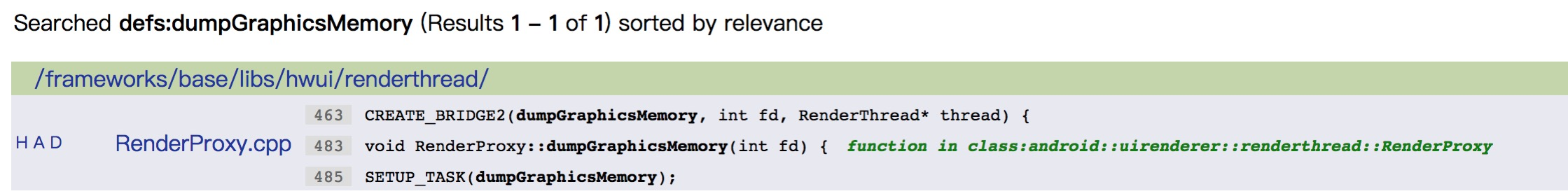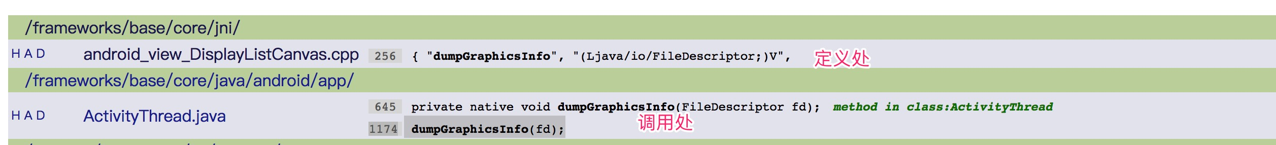 由于涉及C层的源码在AndroidStudio中查看不了,下面的分析使用查看framework源码网站进行。我全局搜索了关键字dumpGraphicsInfo,找到函数定义处:
