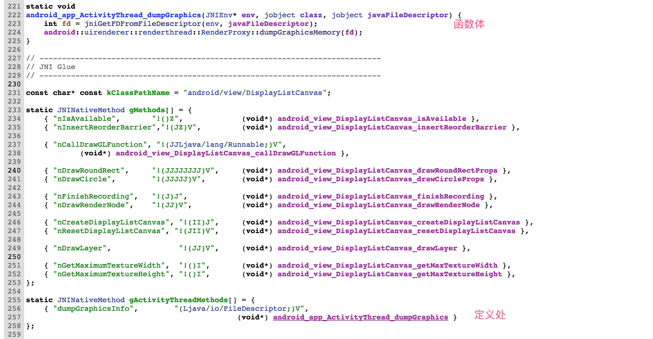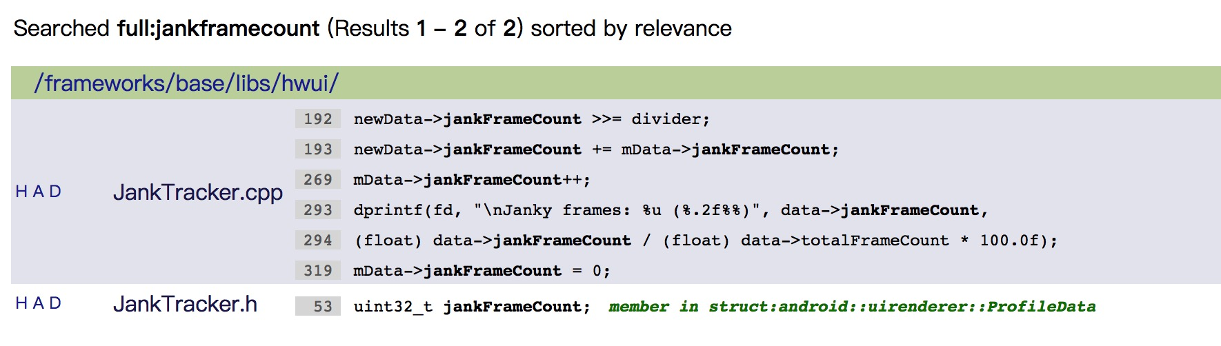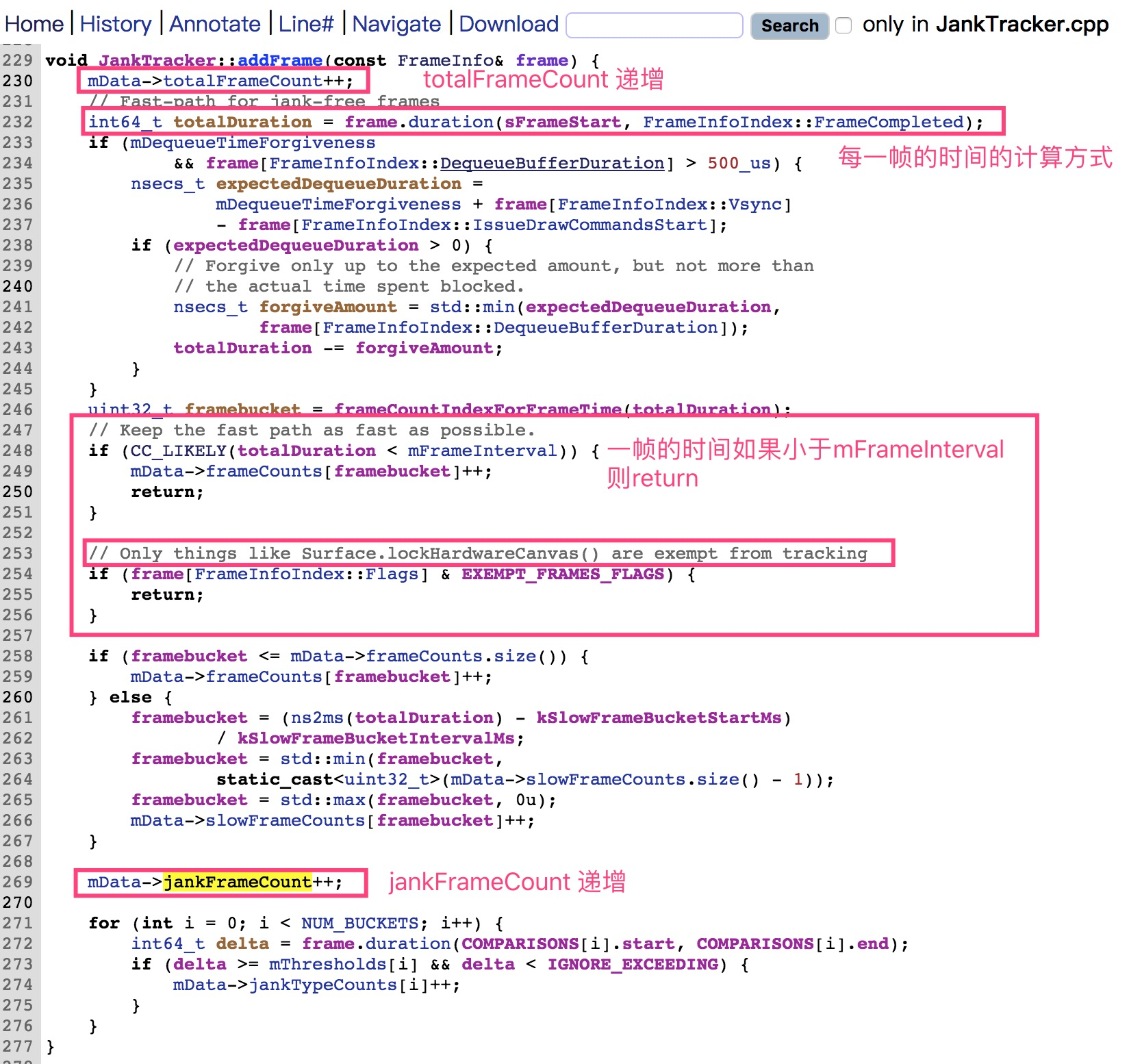 看到JNI我是抗拒的,本科时学的那些C、C++早已记不太清,一想到要看C层的源码,就觉得头大。原本想溜,但是转念一想,我只需要关注它对于"Janky frame"的计算方式,无外乎那些数学运算。只要重点关注函数调用处,搜索关键字,说不定可以找到答案。于是,继续跟进。