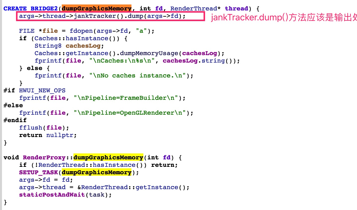 可以看到,我们关心的核心输出(Janky frames部分)以进程区分,并在ApplicationThread.dumpGfxInfo()方法中输出。