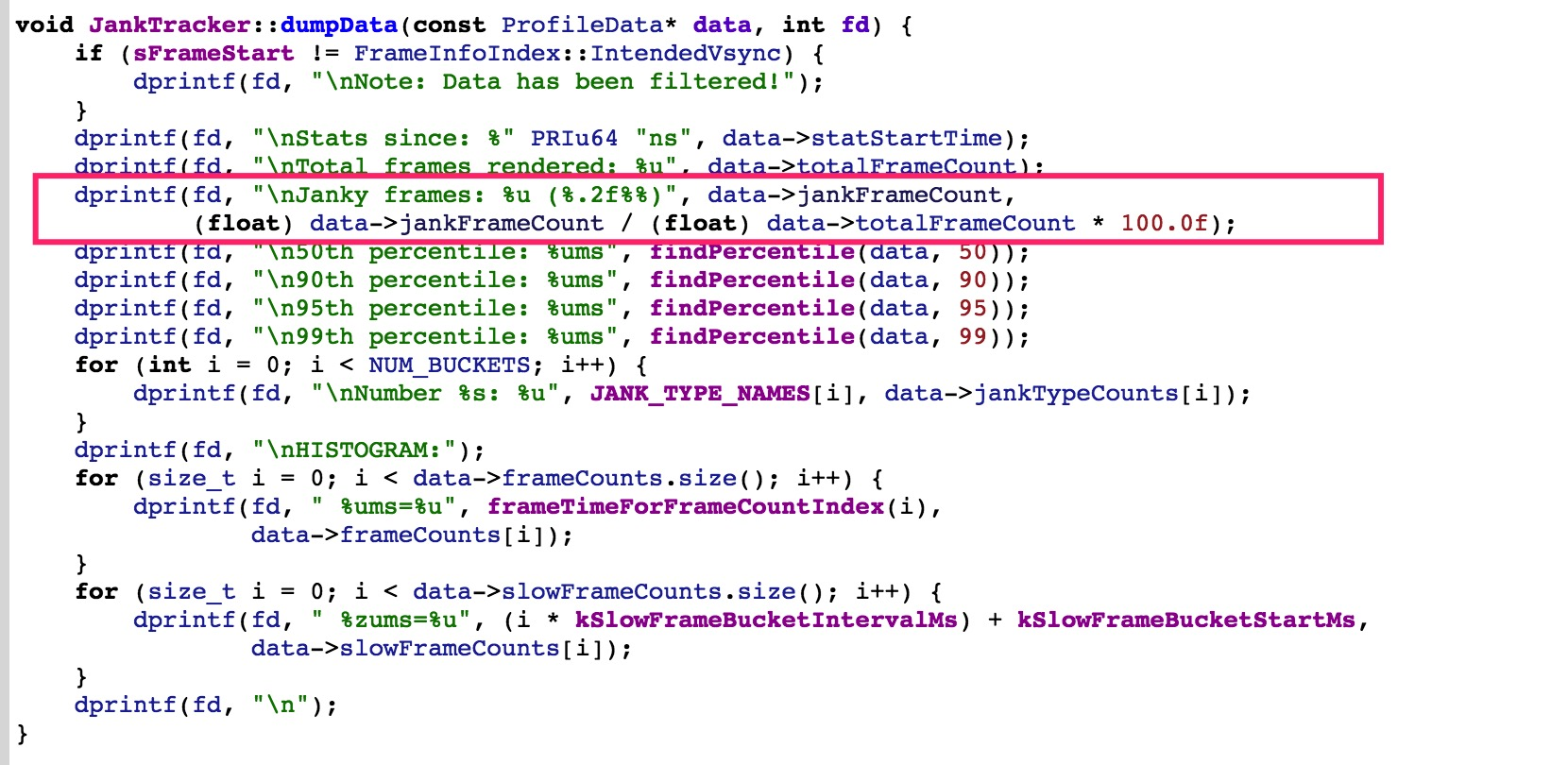 JankTracker.cpp中查看dumpData()方法的具体实现: