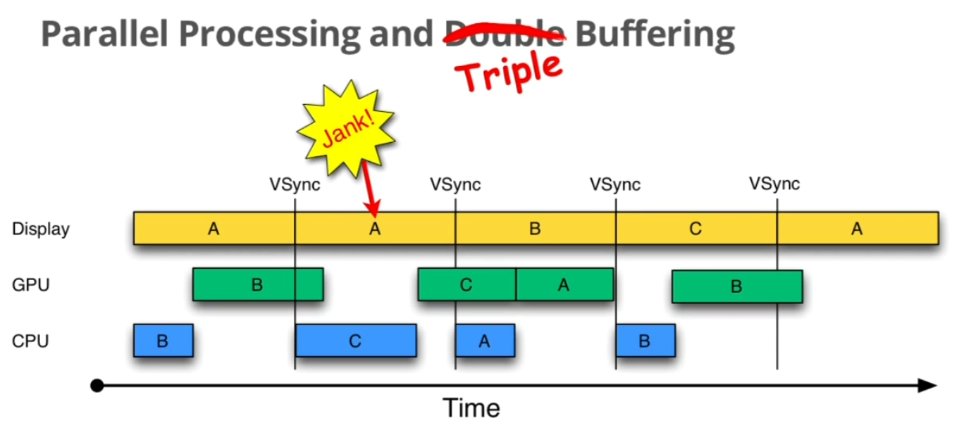 可以看出B先导致了一次视觉上的jank,C理论上也是jank的(相加时间超过了16.67ms),但是由于此时屏幕上显示的是B,C虽然delay了一帧,但是由于C之前的B已经delay了一帧,所以C看起来仍然是紧跟着B显示在屏幕上,而且A顺利的在16.67ms完成了任务,紧跟着C继续绘制了,则用户在视觉上只少看到了一帧。