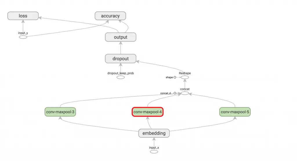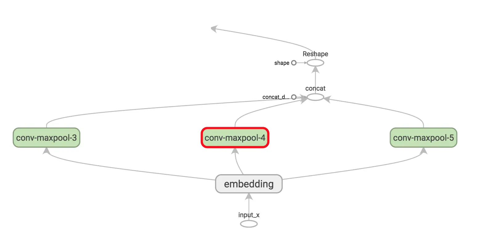 最大池化让我们的张量形状变成了[batch_size, 1, 1, num_filters],最后一位对应特征。把所有经过池化的输出张量组合成一个很长的特征向量,形如[batch_size, num_filter_total]。在TensorFlow里,如果需要将高维向量展平,可以在tf.reshape中设置-1。