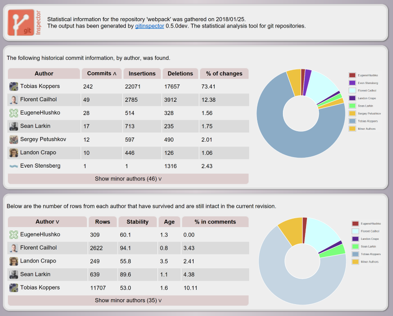 可以使用 gitinspector 一目了然地查看 webpack next 分支上的 Git 贡献统计信息。可以在你的项目上尝试一下,来仔细研究下。 PS:这还不包括我们的 webpack-cli 团队 和 webpack-contrib 组织,他们在支持加载器和插件上面做了大量的工作。
