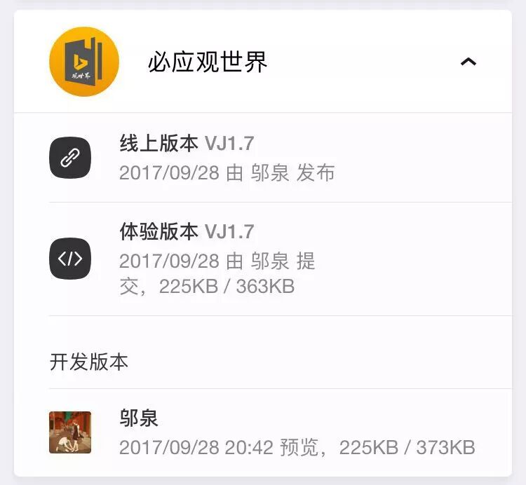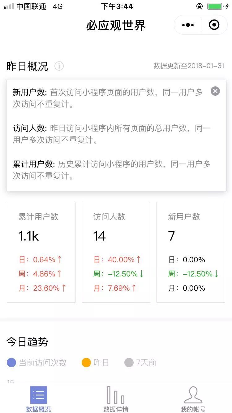 挺惭愧的,累计用户量才1.1k左右。由于上次电脑硬盘损坏,“必应观世界”的源码已经彻底丢失,从2017年9月28日起就已不再维护...一段时间后打算进行销号,不过不必惋惜,必应观世界的功能已并入“窥探时光”中的印象光影馆,点击下方的小程序卡片直接跳转到“窥探时光”中的必应观世界...