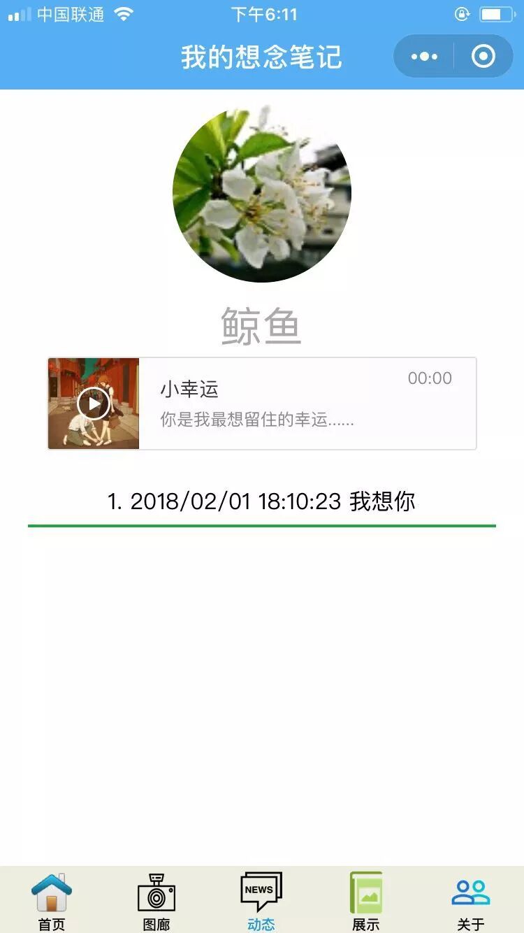 以上是动态页面,显示小程序的日志,每次使用“必应观世界”都会留下一个时间戳和一句我想你。页面上方有一首我最喜欢的歌曲“小幸运”...