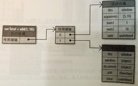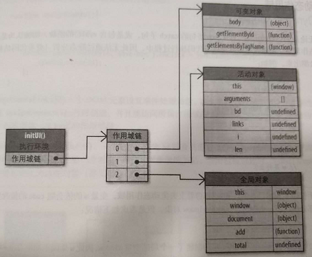 我们把前面的init函数改造了一下,当执行到with语句的时候,执行环境的作用域链被临时改变了,一个新的活动对象被创建,它包含了参数指定的对象的所有属性,并将新的活动对象推入作用域链的首位(这就解决了我们的第一点疑惑,所以定义with语句的目的主要是简化多次写同一个对象的工作)。如图: