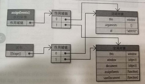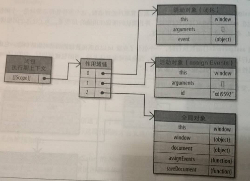 当执行assignEvents函数时,就会创建包含当前环境的第一个活动对象,然后再就是全局的一个活动对象。当闭包被创建的时候,它的[[scope]]属性被初始化为前面的两个活动对象。如下图: