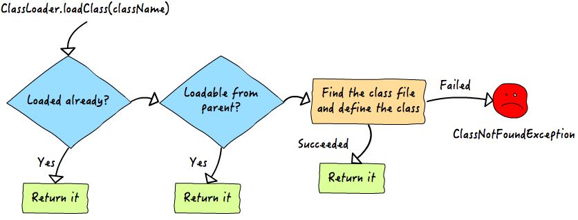前面说了,java中有三个类加载器,问题就来了,碰到一个类需要加载时,它们之间是如何协调工作的,即java是如何区分一个类该由哪个类加载器来完成呢。如前面我们分析的代码一样,Java采用了委托模型机制来加载类,这个机制简单来讲,就是“类装载器有载入类的需求时,会先请示其Parent使用其搜索路径帮忙载入,如果Parent 找不到,那么才由自己依照自己的搜索路径搜索类,如果搜索不到,则抛出ClassNotFoundException”