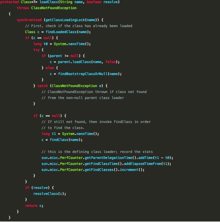 resolve参数的值为true,那么就调用resolveClass(Class)方法来处理类。ClassLoader的子类最好覆盖findClass(String)而不是这个方法(loadClass)。 除非被重写,这个方法默认在整个装载过程中都是同步的(线程安全的)