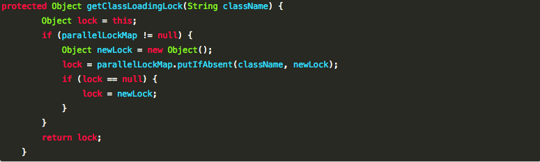 这个时候,我们来简单说明下getClassLoadingLock(String className)的作用,就是: 为类的加载操作返回一个锁对象。为了向后兼容,这个方法这样实现:如果当前的classloader对象注册了并行能力,方法返回一个与指定的名字className相关联的特定对象,否则,直接返回当前的ClassLoader对象。
