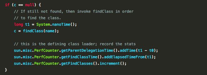 loadClass 方法加载类,如果父加载器为空,那么调用虚拟机的加载器来加载类。