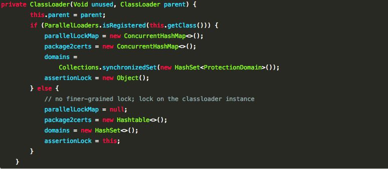 ParallelLoaders 的Registered 状态的不同来给parallelLockMap 赋值。 我去,隐藏的好深,好,我们继续挖,看看这个ParallelLoaders 又是在哪赋值的呢?我们发现,在ClassLoader类中包含一个静态内部类private static class ParallelLoaders ,在ClassLoader 被加载的时候这个静态内部类就被初始化。这个静态内部类的代码我就不贴了,直接告诉大家什么意思,sun公司是这么说的:Encapsulates the set of parallel capable loader types ,意识就是说:封装了并行的可装载的类型的集合。