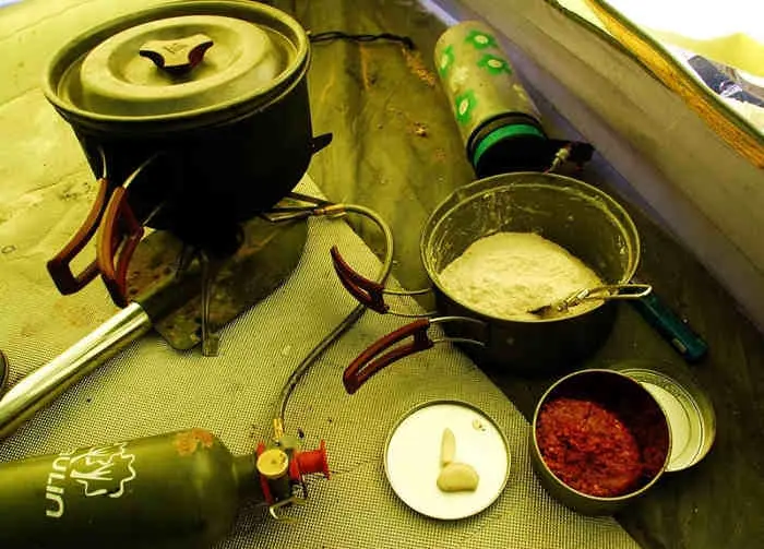 此行,食物约有一百斤,其中主食七十七斤,包括五十斤糌粑、二十五斤压缩饼干、二斤麦片,实际使用七十五斤,前期糟蹋了二斤主食。辅食二十五斤,大蒜、酥油、花生米三样就占了一半。其余是少量的盐、紫菜、辣椒粉、茶叶等,以及一点打牙祭的奶粉和白糖。全程无肉,吃过一次蔬菜,微量元素靠金施尔康药片。