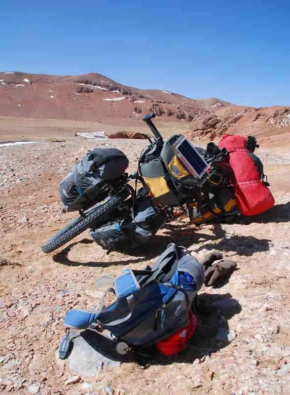 从徒步角度看,推行速度确实太低了,一半都达不到。选择自行车作为穿越工具并非为骑,它只是一个驮货工具。四个驮包分别置于前后轮两侧,相机包挂在车头,一个二十五升的骑行包随身背着。后货架上还有一个六十升防水驮包,用弹性松紧绳捆绑,其间夹塞着防潮垫、水袋、拖鞋等。驮包总容量一百八十五升左右,不包括外置的盛水容器、闲杂物品等,所有装备总重二百斤左右。试想,推着一辆二百斤的自行车在海拔五千米的沙地里推行,实在是一件令人沮丧的事情。