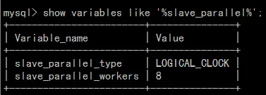 STOP SLAVE SQL_THREAD;SET GLOBAL slave_parallel_type='LOGICAL_CLOCK';SET GLOBAL slave_parallel_workers=8;START SLAVE SQL_THREAD;