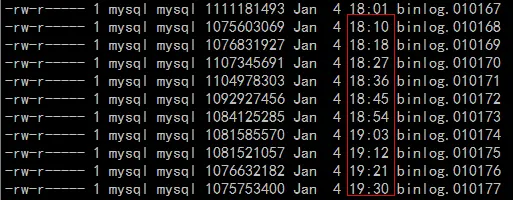 转换后,发现主从延迟逐渐增大,基本每天落后主机大概50个binlog左右,大概延迟7.5个小时左右的数据,主机每天大概产生160个binlog,binlog列表如下图所示: