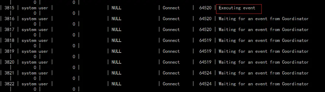 我的环境如上图所示,本来就已经是多线程复制了,因此问题的根源也不在是否开启多线程复制上。但是当我使用show processlist查看复制状态的时候,大多数情况下发现只有1个SQL线程在执行,如下图所示: