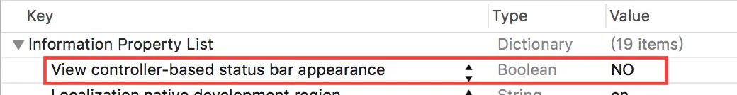 注意:添加的View controller-based status bar appearance是Bool类型,默认为Yes