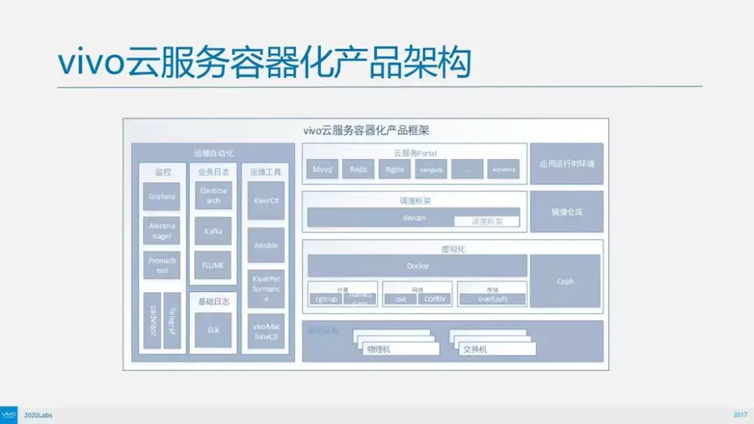 再来看右边,是vivo的基础设施,物理机和交换机,网络设备和防火墙等,上面是Docker,Docker容器虚拟化技术把物理机上面的相关资源虚拟化用起来。