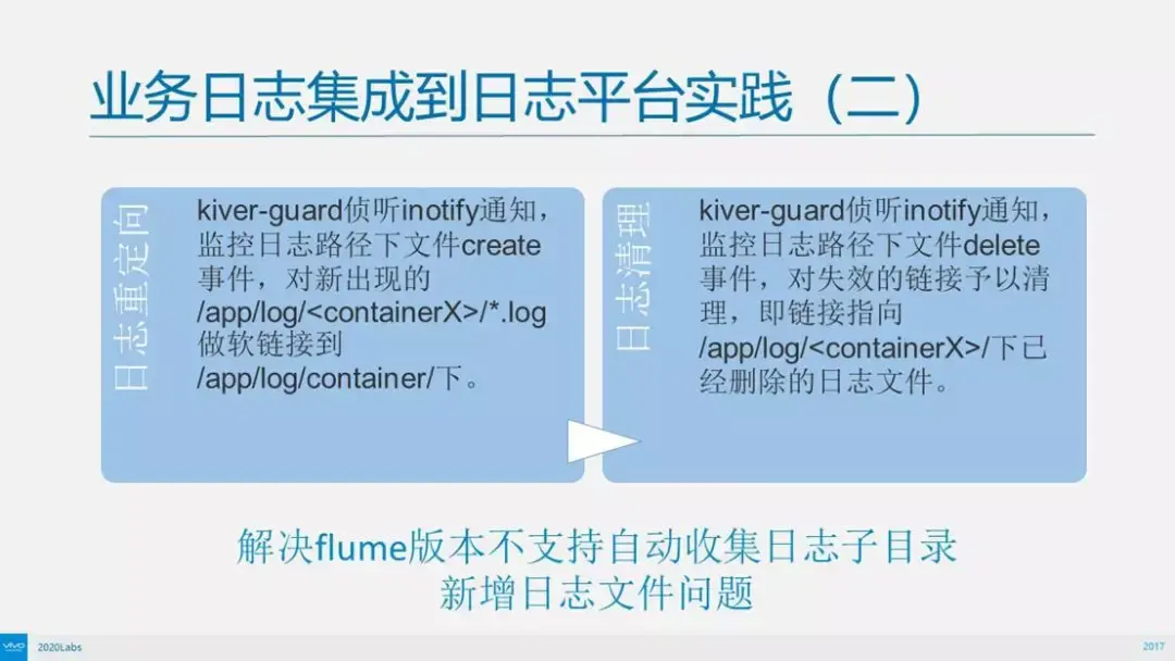 这是vivo日志采集的实践,在宿主机上做日志分区,容器运行起来之后挂这个目录,每个容器起来之后会创建一个自己的文件目录。外面有kiver-guard,用来侦听内核文件系统的新日志文件创建的通知。
