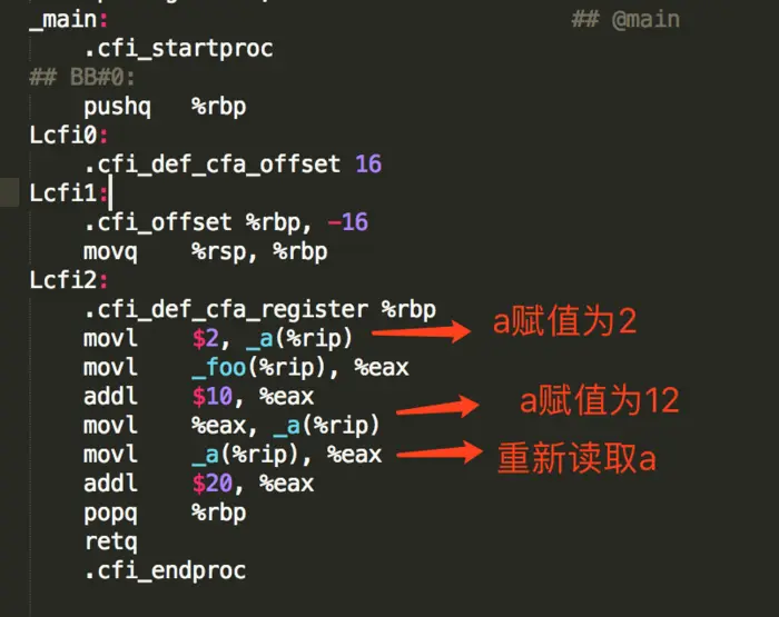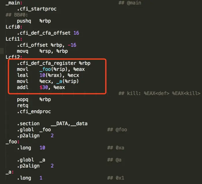 1 2 3 4 5 6 7 8 9 10 11 12 13 | #include <iostream>int foo = 10;int a = 1;int main(int argc, const char * argv[]) { // insert code here... a = 2; __asm__ volatile ("" : : : "memory"); //编译器屏障 a = foo + 10; __asm__ volatile ("" : : : "memory"); int b = a + 20; return b;} |