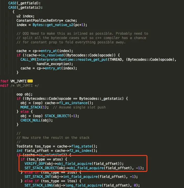 同样在bytecodeInterpreter.cpp文件中,找到getstatic字节码指令的解释器实现。
