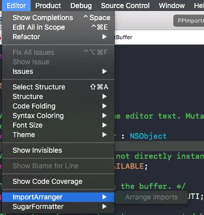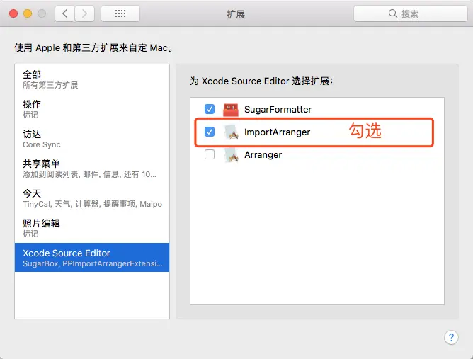 当我们下载好了一个 .app 格式的插件之后,将 .app 文件拖到应用程序(Applications)文件夹中,双击这个 .app 文件,然后在 系统偏好设置-> 扩展 -> Xcode Source Editor Extension 勾选该插件,最后重启 Xcode 就可以在 Editor 菜单中找到该插件了。