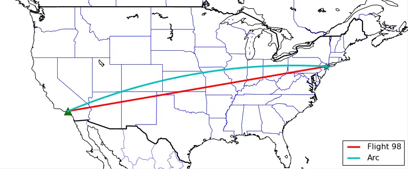 m.drawgreatcircle(NYClon, NYClat, LAlon, LAlat, color='c', linewidth=3, label='Arc')