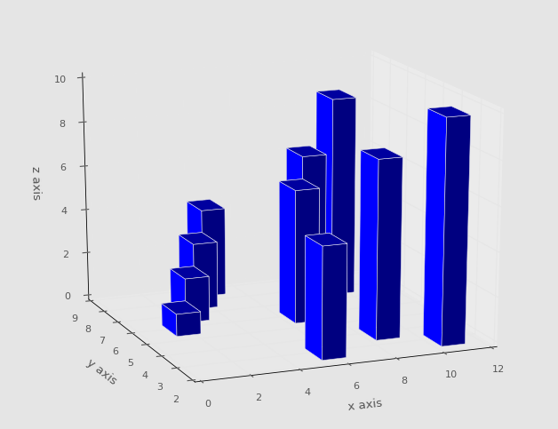 对于条形图,你需要拥有条形的起点,条形的高度和宽度。 但对于 3D 条形图,你还有另一个选项,就是条形的深度。 大多数情况下,条形图从轴上的条形平面开始,但是你也可以通过打破此约束来添加另一个维度。 然而,我们会让它非常简单: