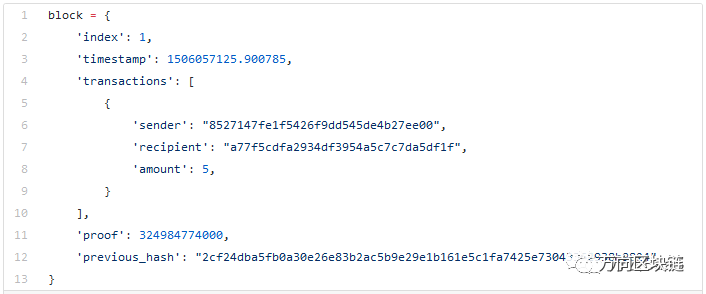 每个区块所包含5个基本属性:index,timestamp (in Unix time),交易列表,工作量证明和前一个区块的哈希值。我们来看一个例子: