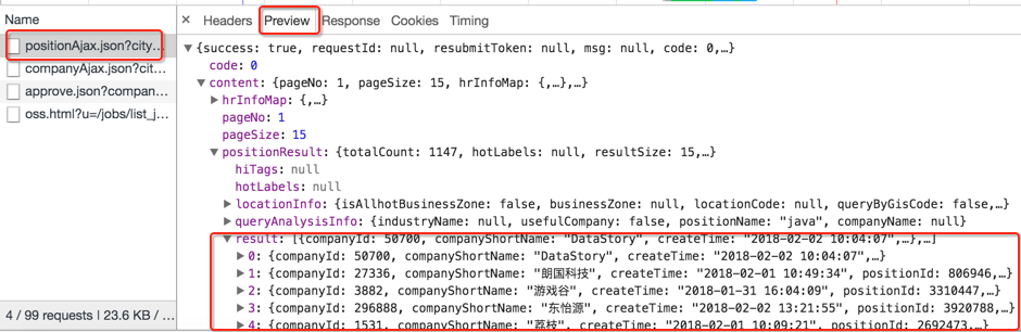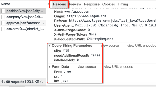 前面我们说到,拉勾网关于职位的信息是异步加载的,那么在这一系列的网络请求中,必定有某个请求发送给服务器,响应回来的是职位信息。