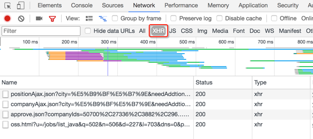 正常情况下,我们可以忽略css,图片等类型的请求,关注点放在XHR这种类型请求上,如图: