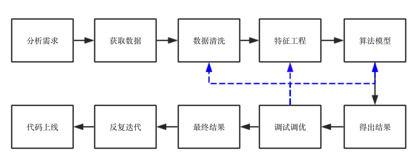 按照我做项目的经验,来了项目,首先是分析项目的目的和需求,了解这个项目属于什么问题,要达到什么效果。然后提取数据,做基本的数据清洗。第三步是特征工程,这个属于脏活累活,需要耗费很大的精力,如果特征工程做的好,那么,后面选择什么算法其实差异不大,反之,不管选择什么算法,效果都不会有突破性的提高。第四步,是跑算法,通常情况下,我会把所有能跑的算法先跑一遍,看看效果,分析一下precesion/recall和f1-score,看看有没有什么异常(譬如有好几个算法precision特别好,但是recall特别低,这就要从数据中找原因,或者从算法中看是不是因为算法不适合这个数据),如果没有异常,那么就进行下一步,选择一两个跑的结果最好的算法进行调优。调优的方法很多,调整参数的话可以用网格搜索、随机搜索等,调整性能的话,可以根据具体的数据和场景进行具体分析。调优后再跑一边算法,看结果有没有提高,如果没有,找原因,数据 or 算法?是数据质量不好,还是特征问题还是算法问题。一个一个排查,找解决方法。特征问题就回到第三步再进行特征工程,数据质量问题就回到第一步看数据清洗有没有遗漏,异常值是否影响了算法的结果,算法问题就回到第四步,看算法流程中哪一步出了问题。如果实在不行,可以搜一下相关的论文,看看论文中有没有解决方法。这样反复来几遍,就可以出结果了,写技术文档和分析报告,再向业务人员或产品讲解我们做的东西,然后他们再提建议/该需求,不断循环,最后代码上线,改bug,直到结项。
