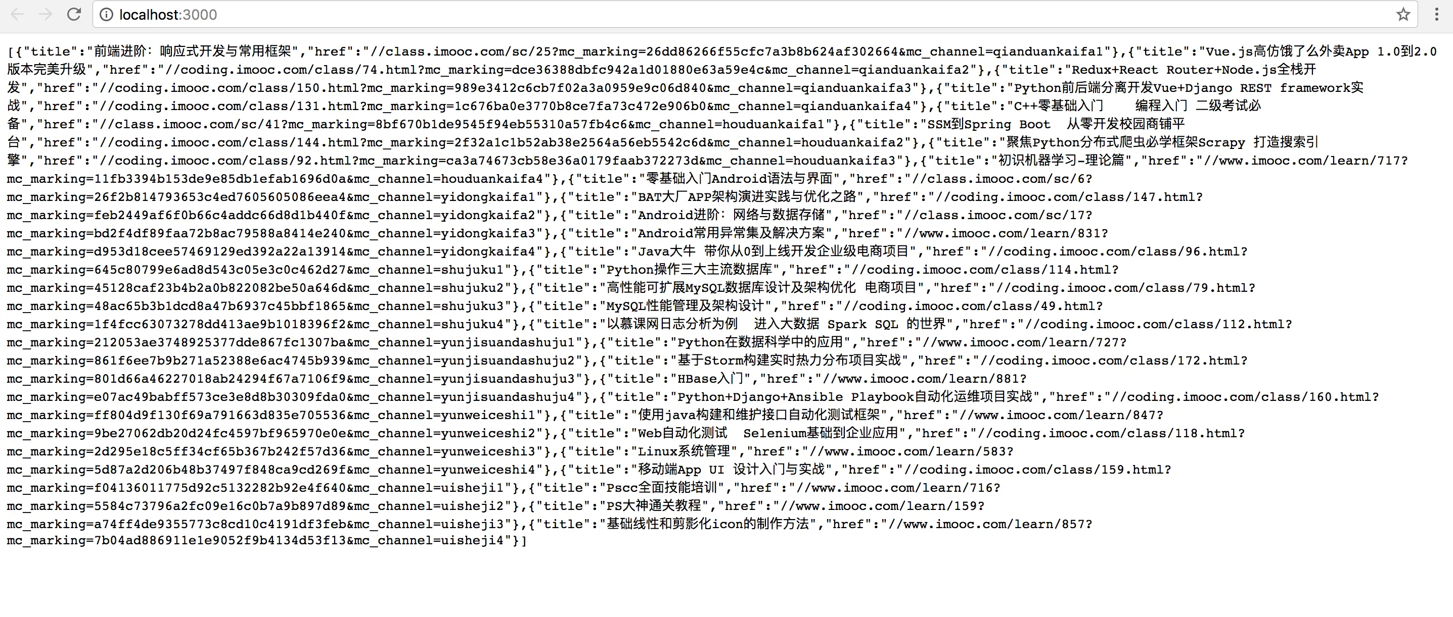 当在浏览器中访问'http://localhost:3000'的时候,可以以json的形式输出慕课网首页的 部分热门课程(本人偶尔会去慕课网上看一些学习的视频)