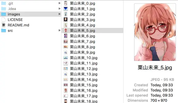 接着就是把图片保存下来,我们事先建立好一个 images 目录,把图片都放进去,命名的时候,以数字命名。